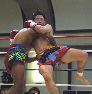 そして最終ラウンド。佐藤の得意とする左ハイキックが初めてタイ人の首筋にクリーンヒットし場内が沸きあがる。しかし動じないラムナムムーンは首相撲からの膝蹴り、ミドルを連打の猛攻。これをなんとか凌いだ佐藤、長かった最終ラウンドのゴングをリングの上で立ったまま聞いた。