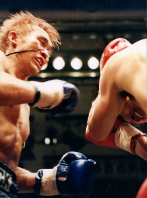4Rになると米田の左ミドルの勢いが増す。右フックも庵谷に負けず劣らず強烈だ。庵谷はいい当たりをもらうと「来い!」とばかりに腕を振り挑発する。逆に効いている証拠か。序盤のようなラッシュも見られなくなり、徐々に敗色が濃くなってきた。
