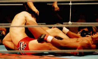 果敢にタックルで攻めた美濃輪が、ガサウェイのガードした足をほどきアンクルホールド。