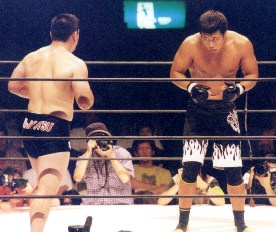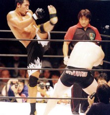 残り時間2分。ようやく柳澤は下から肘、パンチを出す。嫌がった小路が2度立ち上がりかけたが、また突っ込んで行ってインサイドガードに戻る展開。小路が3度目に立ちあがったとき柳澤も起き、残り1分で再びスタンドの展開に。しかし決定打は互いにないまま、試合終了。判定のないパンクラチオンマッチは、時間切れの場合全て引き分け。実際内容的にも引き分けが妥当なところだろう。小路の場合、相手の寝技を殺しながらチャンスを窺い、パンチでじわじわ判定ポイントを稼ぐのは常套手段であり、今回はリ−チの違う柳澤をスタンド勝負で突き放せなかったのが痛かった。完全決着のないパンクラチオンル−ルでこの展開とあって、小路は試合後は素早く退散。期待されたマイクアピ−ルは幻と終った。