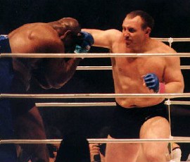 スタンドの攻防が続く。グッドリッジのファウルカップが割れ、その場でグッドリッジが腰にタオルを巻き付けファウルカップを交換し、失笑の起こるシーンも。最後はフック一発でボブチャンチンがKO 結果一覧に戻る 次の試合 →