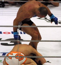 組むと今度はヒザとアッパーが飛んでくるのを嫌って、パンチで突き放す桜庭だが、勢い甘って前のめりになったときに魔の瞬間が訪れる。首を捕らえたシウバが右のヒザをヒットさせたのだ。遮二無二パンチを振るって首相撲から逃れようとする桜庭の顔面に、シウバのストレートがぶち込まれる。この一撃はもろにクリーンヒットし、ロープを背負って守勢一方の桜庭は苦し紛れにタックルに出る。しかし、これを受け止めたシウバは首を取って、四つんばいの桜庭の顔面に二発三発と凶暴なヒザを飛ばす。この攻撃は今回から採用された新ルールで、かねてよりシウバに有利とされていたものだ。必死に、立ち上がろうとする桜庭をコーナーに詰めてパンチのラッシュ、止めのヒザを放つシウバ。