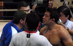 のコナン戦で見せた“死んだふり”の攻撃パターンがあり、なまじそうした背景を知っている島田レフェリーゆえのためらいがあったのかもしれない。まるでゴキブリにょうにマットに這いながらシウバの足を求めて行く桜庭。だが、アドレナリン全開になっているシウバの攻撃は止まらない。上半身を起こした桜庭の顔面にためらい無くハイを放とうとする闘争本能は、まさに過酷なブラジリアンヴァーリトゥードで生き残ってきた強豪のそれだ。そのわずかな隙にも足を捕らえに行く桜庭だが、シウバの攻撃はさらに容赦が無い。いざる桜庭の背中を片手で押さえながら、頭部に標的を定めて蹴りを放つ非情なテクニックに、その越えてきた修羅場の数を感じさせる。押さえ込んだ頭に二発三発と身体ごと飛び込むような的確なヒザが入る。動きの止まった桜庭はかろうじて仰向けに逃れようとするが、その顔面に止めのローが吸いこまた瞬間、レフェリーはようやくストップを宣告した。これで桜庭は昨年のGP以来の三連勝でストップ。
