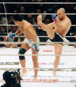 衝撃のランデルマンKO事件が勃発したUFC32から約三週間。早くもその張本人であるチャック・リデルが日本上陸を果たした。PRIDE代表で迎え撃つ形となったメッツアーは先手先手でスピードのあるパンチを繰り出し、UFCのワンナイトヒーローとなったリデルの大砲パンチを射程圏内に寄せ付けない。距離を測りかねたチャックを、一方的にスタンドで攻め立てるメッツァーの姿にはかつて“膠着王”と呼ばれた時代の面影は感じられない。1R後半にはテンプルへの左フックでチャックをぐらつかせ、あわやKOというシーンも見られた。