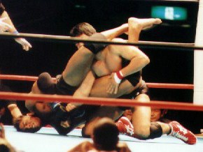組みに行く滑川。首をがぶって引き込むオーフレイム。首は抜いたものの、手首を掴まれたままガードに捉えられる滑川。オーフレイムの柔らかい身体が、しなやかな足がすすっと動き、そのまま下から滑川を腕十字に極めた。