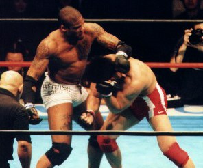 前蹴りが鳩尾に食い込む。後ろに吹っ飛ばされる田村をアイブルが追いかける。左、右とパンチが顔面に吸い込まれる。