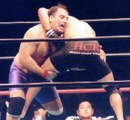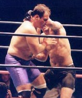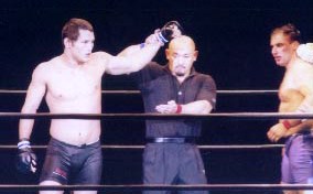 UFCの猛者の登場が続く。グレコ・ローマン世界選手権2位。第17回のUFCではミドル級トーナメントを制しているダン・ヘンダーソン。ランディ・クートゥアをセコンドに引き連れての登場である。勿論、オープン・フィンガー・グローブを着用。