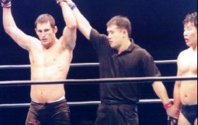 だが、組んで倒したところで、ヘンダーソンのパンチが金原の顔面を襲い、鼻血を出してしまう。ヘンダーソン、イェロー。しかし、二戦目で呼吸が苦しくなってくるところで、鼻血というのは大きなハンディキャップだ。