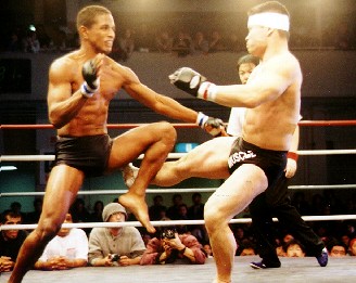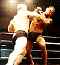 一週間前に練習で額を切った桑原、頭部を鉢巻き状にテーピングして入場。両者の身長差は18センチ。エドゥアウドの長い足から繰り出される伸びやかなキック、勢いのあるフックにヒヤリとする場面が何度かあったが、桑原のパンチもよく入っていた。物怖じせず突進する桑原の姿勢に満員の客席も次第に引き込まれていく。組みあう場面は一瞬で、すぐに打撃戦に戻るという展開が何度も続く。桑原のソバットに湧くシーンも。2Rはエドゥアウドがテイクダウン、左足だけパスするが、桑原は右足をがっちり両足で挟み込み動きを封じ込める。 3R早々ローブローでエドゥアウドが土下座し笑いが起こる。しかしエドゥアウドはスタミナ切れか、自ら猪木アリ状態に逃げ込む。すかさず桑原は飛び込みトップからパンチを打ち降ろし歓声が起こる。終盤リング際で桑原が首をキャッチしかけるが、ドントムーブの最中も攻め続けたのでレフェリーから注意を受け極めきれず。 結局判定は三者とも桑原に軍配。それでもがっかりした様子の桑原だったが、カメラマンの要請に答えマッスルポーズ3パターンを披露するサービスは忘れなかった。 |