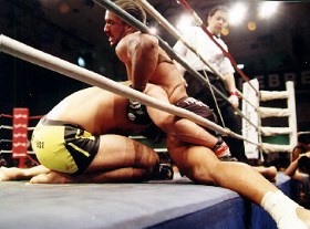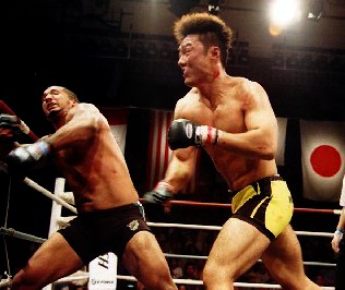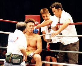 しかしギブソンは汗を血だけではなく、パワーも破格。強烈なフックで須田を寄せ付けない。組み付いてヒザ蹴りで気をそらしてからフックをお見舞いするテクニックも見られた。3R終盤には須田に足関節を狙うチャンスが訪れたが、汗ですべってしまい、しかもギブソンはロープの外にまで逃げようとしてしまう。その前にも同じような行為があったため減点1が課された。