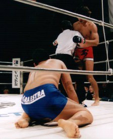 再開後もキックを繰り出す池本に対して、大河内が距離を置いてのカウンターパンチ狙いに徹したため、スタンドでの展開が単調になりかけた...かと見えたラウンド後半、池本が動いた。相手コーナーに大河内を追い込んで、いきなり飛びヒザ蹴りを顔面に見舞ったのだ。遠間合で下がっていた事が災いして顔面ガードの開いていた大河内はもろにこれを食らい、ロープを背に腰が砕ける。すかさず首を捕らえてヒザのラッシュをぶち込んだ池本の猛攻に、たまらずダウン。カウントを数える鈴木レフェリーの目の前でロープにすがって立ち上がろうとした大河内だが、カウント10でもふらついた腰は元には戻らず、池本のKO勝ちが宣告された。