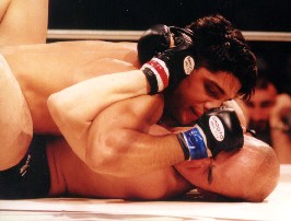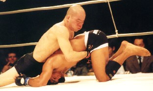 1R開始のゴング直後,最初にテイクダウンをとったノゲーラ。そのまま上になりチャンスをうかがうノゲーラに対し、相手の右腕を押さえガードポジションの巽。動かない…。そのままの膠着状態で約7分が経過。このあたりから、ノゲーラ、上からのパンチにより巽の顔面が出血。ここで1R終了のゴング。