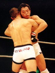 前半の三試合を鮮やかな連勝で飾った日本チーム。ここは終盤へ向けて一気に勝ち越して欲しい。ファンの声援が頂点に達するなか、宇野が迎え撃つはブラジル・ルイス&ペデネイラス柔術からアンドレ・ペデネイラス。‘98年のVTJでは佐藤ルミナをTKOで下している。佐藤ルミナ、ジョン・ルイスをチョークスリーパーで下している宇野に対して、「彼は礼儀正しく笑顔が明るい。そして物腰も柔らかいんだ。だから対戦する選手はちょっとした油断をしてしまうんだ。でももうその手には私はのらない。よく研究したよ。私は彼の弱点を攻める」と語った。