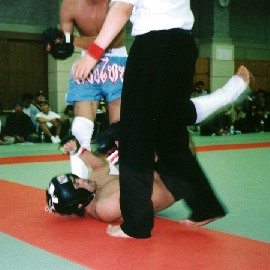 何度か観られたこの動きの中で、テイクダウンのポイント1が徳岡に加算され