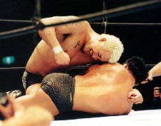 試合も終盤にさしかかり、疲れの見え始めた両者。圧力のある謙吾が稲垣を詰めていくと言う展開は変わらないが、今度は稲垣が謙吾を浴びせ倒す。先程の攻めで謙吾が予想外に上半身の防御がしっかりしていて、それなりのポジショニング技術も備えてると感じたのか、「はじめから狙ってた」、とにかく極めの強い方が1本を取れる脚をとり、足首固めへ。しかし、全く極めに行くことは考えていない謙吾は、これに付き合わず、脚の取り合いとはならない。そのままなんとか逃げようとするものの、稲垣は相手の動きに合わせて巧みに足首を捻る。完璧に極まった、様に見えた。苦悶の表情を浮かべる謙吾。エプロン際で、稲垣としてはアウト・サイドのブレーク狙いが気になるポジションだったが、「そういう気はぜんぜん無かった」謙吾は、「ギブアップ?」とレフェリーに問いただされながらも、「ノールールならああいう場合で上から殴って何とかなる」と、ガンガン打撃を入れていく。だが、稲垣もそんなことでは極めを緩めない。しかし、ここで試合終了のゴング。