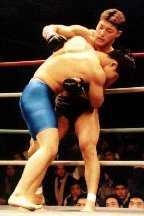ゴングと共に飛びだした桜井は、パンチの連打で竹内に襲い掛かる。あれよれとコーナーに押し込まれた竹内は、とにかく抱きついて桜井の火勢を押さえ込むのが精いっぱいだ。桜井にすれば、寝技で須田と渡りあった竹内にグラウンドでつきあいたくはない。すがる竹内をパンチで突き放すと、グラウンドにころがった所へパンチを落して一機火勢に勝負を付けに行く。しかし、竹内はすばやくオープンガード体勢で迎撃、サイドから回り込もうとした桜井のパンチを躱し、アリ−猪木体勢に持ち込む。