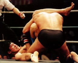 今度は桜井がガードする番だが、ここでも下からパンチを打ち返していく。ただ寝技の切れでは格段に竹内が勝る。よっこらしょと言う感じでスピードの乗らない三角絞めをしかける桜井の両足を、振り捨てるようにサイドへ飛びだす。上四方から十字を狙う竹内だが、桜井は上半身を押し込みパワーでこの仕掛けを潰してしまう。立ち上がった桜井は、ふたたびアリ−猪木体勢で竹内と睨みあう事になった。
