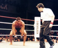 シ ウバは体調が相当悪かったのであろうか。ファイトの最中にヒザに手を付いて休もうとして打撃をもらったり、座り込んでなかなか立ち上がれなかったりと、会場から失笑を浴びることしきりだった。「試合中ゲロ吐かれたらたまらんな」と真剣に心配したほどである。
