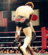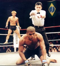 1Rの開始から,桜井は得意の打撃でオリヴェイラを圧倒する。桜井のローキックの重い打撃音に会場が沸く。必死に組んでいくオリヴェイラだが,桜井は冷静に首相撲で相手の体勢を崩したあと,オリヴェイラの顔面を狙って飛び膝蹴りを2連発。たまらずにダウンするオリヴェイラ。立とうとするが,足がもつれて立ち上がることができない。10カウントと同時にガッツポーズで勝利をアピールする桜井に熱狂する観客。消化不良気味の第3試合でしらけていた観客のムードを,桜井は膝蹴り1発で一変させてしまった。粗削りな印象もあった桜井だが,昨年の大躍進によってルミナのようなカリスマを感じさせるファイターに成長したようだ。2年目のジンクスも噂されたが,桜井は99年を秒殺KOという最高の形でスタートさせた。今年もマッハの快進撃は続きそうだ。